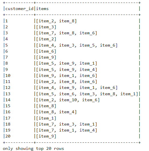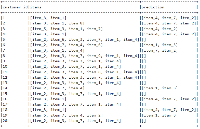 Finally, we want a prediction column containing the recommendations we found for each customer based on their current itemset. Note that some of the customers may not get any recommendations this can be tuned by the Min_Support and Min_Confidence parameters.