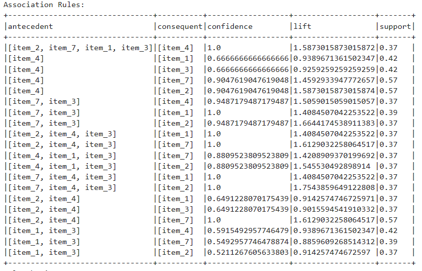Association Rules are what our model learned from the data. It has an antecedent which means the items already in the itemset, and a consequent which is the recommendation based on the current itemset, this rule has confidence which shows how certain our model is about this rule. In practice, a cut-off of 0.5-0.8 can be applied to the confidence.