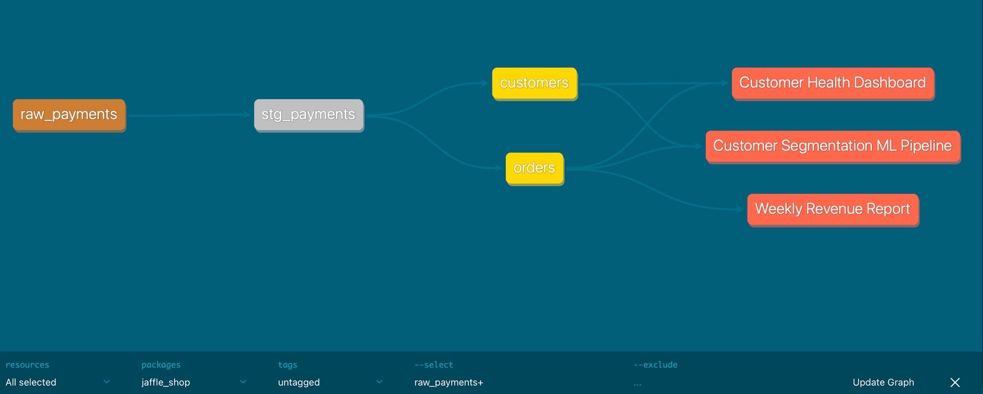 Let’s say the raw_payments source table (here a seed) has an issue, a raw_payments+ query shows the whole lineage down to the affected exposures: